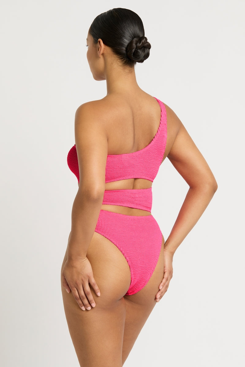 The Rico One Piece will add a luxe touch to your swimwear look. This asymmetric one shoulder piece is designed with slashed cut outs and a high cut on the hip, enabling you to choose from low, mid, or high coverage.