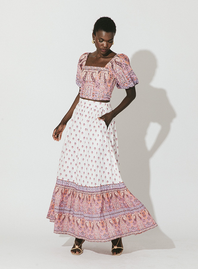 Discover the perfect blend of style and culture with the Cleobella Reece Skirt in Mahal Print. Featuring a beautiful block print design and a contrast hemline in an alternative pattern, this skirt is a must-have for any fashion-forward individual.
