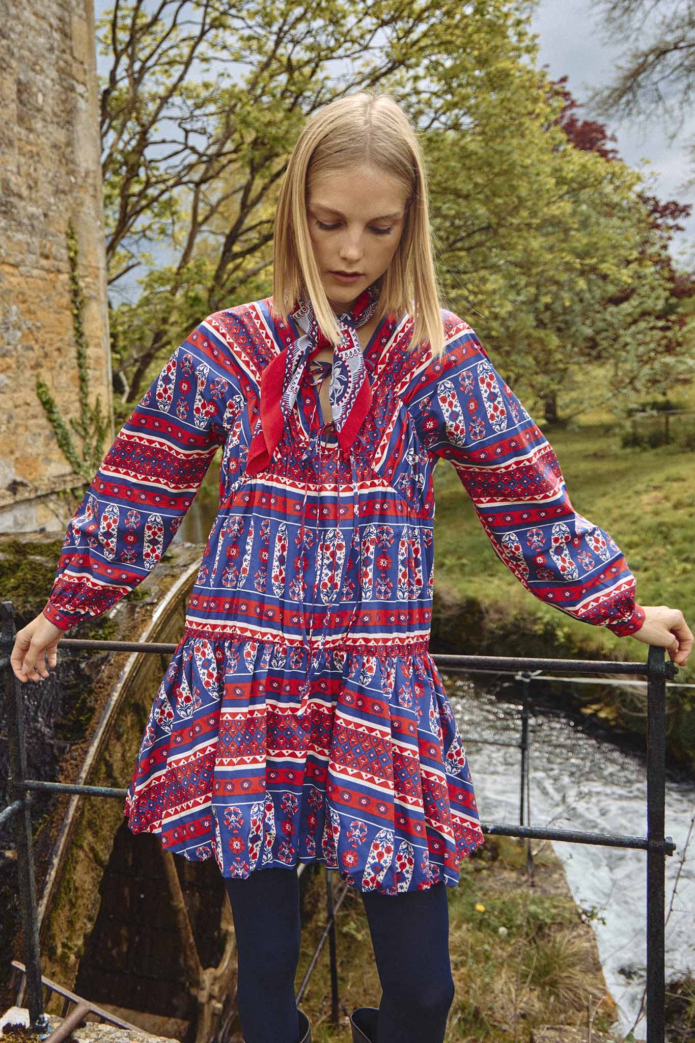 Sawyer Dress, a relaxed yet elegant piece defined by its V-neckline & long raglan blouson sleeves. The gathered bodice, with delicate tie details, flows effortlessly into shirred seams & a bubble hem, creating a playful swing silhouette that exudes charm.