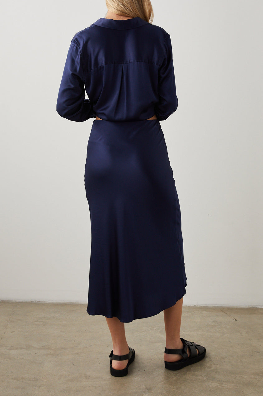 This high-waisted pullover style midi-length skirt features a concealed elastic waistband and satin crepe fabrication. Pair with a t-shirt or over-sized sweater for an easy daytime look, then just add heels for an effortless transition to night.