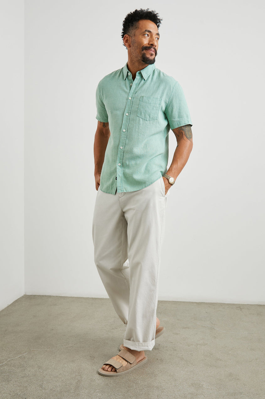 This lightweight, summer-ready shirt is made from a pigment-coated linen blend. It's done in a classic green shade and is complete with a collar, full-length buttons, and single patch pocket at chest.