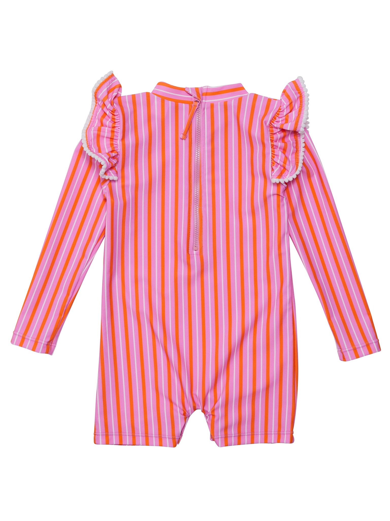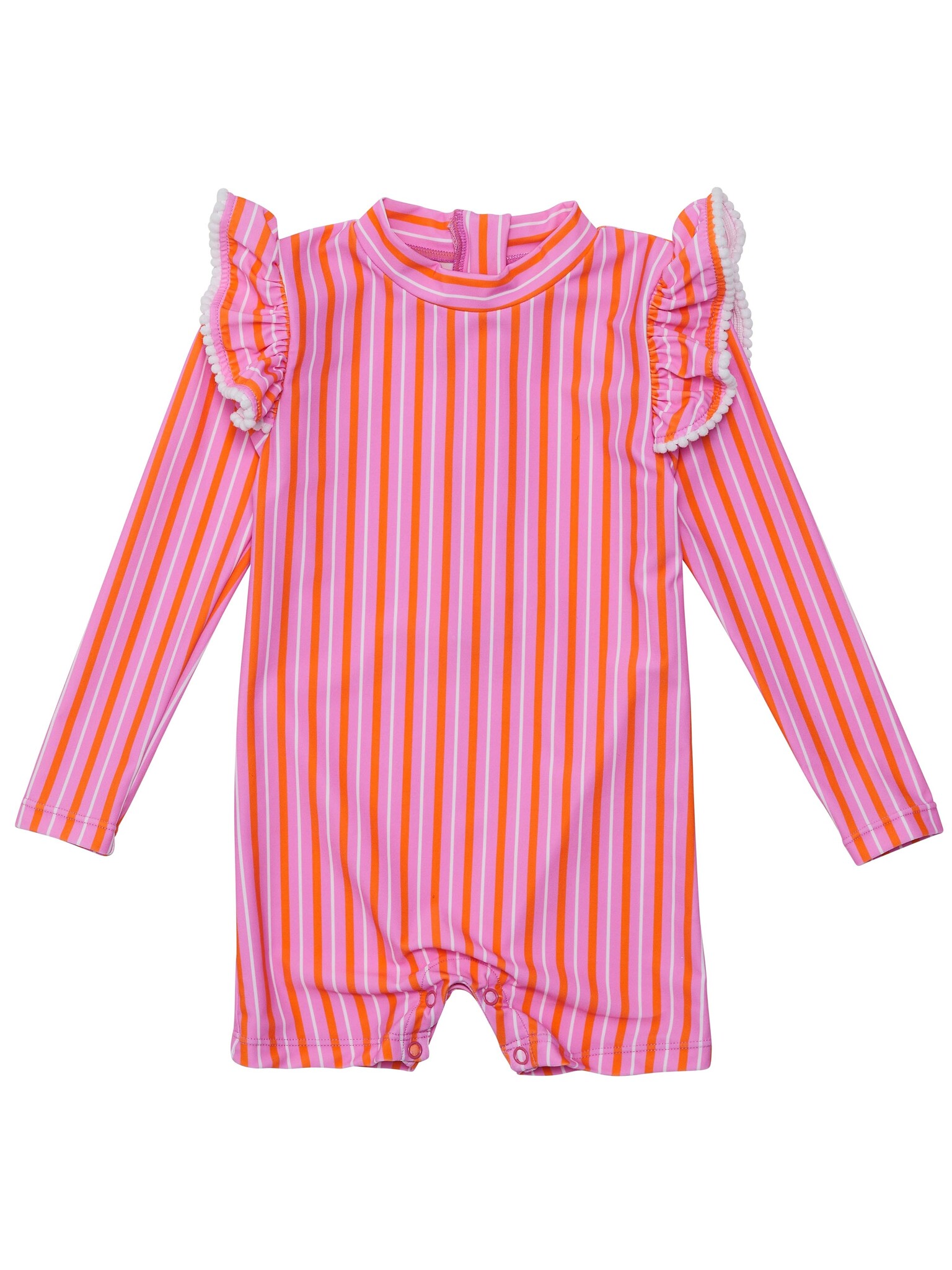 Wrap your little beach-goer in the soft glow of a sunset with this pink striped sunsuit. Adorned with delicate frills trimmed in white mini pompoms at the shoulders, it’s crafted for ease with a back zip and secure snap domes, ensuring quick changes.