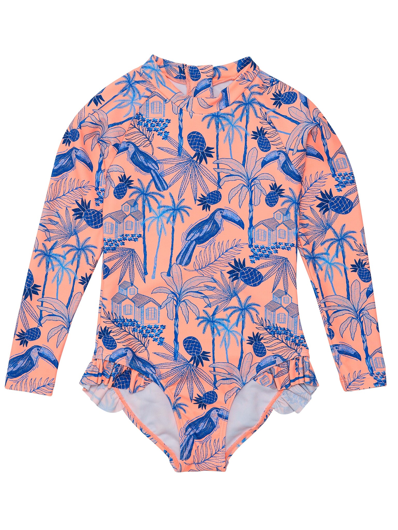 Ride the tropical tide in this frilled surf suit, decked out in a lively toucan print perfect for little ocean explorers. It features a handy peach-colored back zip closure for quick changes and fun leg frills that flutter as they play.
