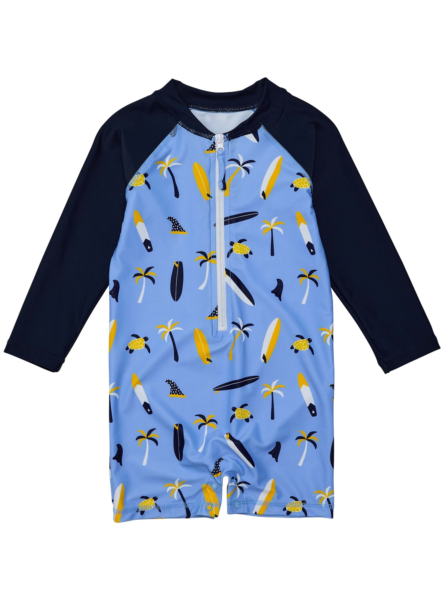 Ride the tides in this long-sleeve sunsuit! With a front zip for easy access and navy accents on the collar and sleeves lend to its smart look and practicality, while blue snap domes at the crotch ensure easy changes.