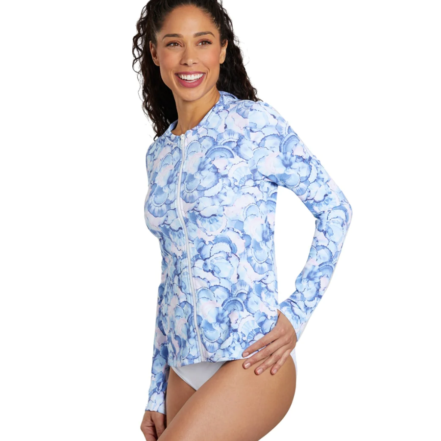 Get into the vacation mindset with the Tommy Bahama Women's Island Cays Abalone Full Zip Long Sleeve Rash Guard, featuring effortless 4-way stretch fabric, a flattering cut, and comfort that compresses the body and smooths the silhouette.