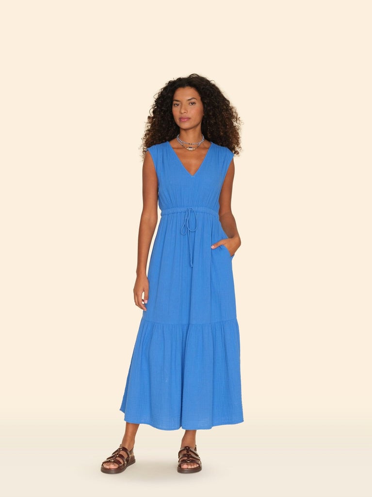 Easy Breezy. Rosalie is made in our washed double faced cotton gauze for a soft, gently crinkled feel. Rosalie is a sleeveless maxi dress with a deep V-neck, cap sleeves, elasticized drawstring waist, and ruffle hem.